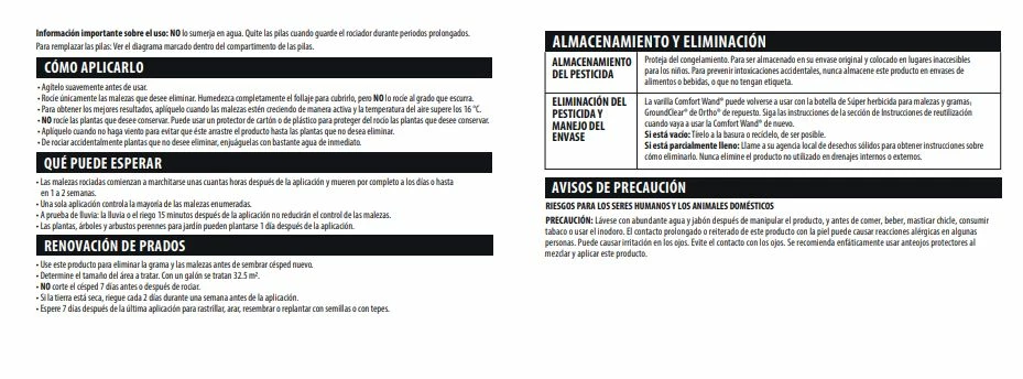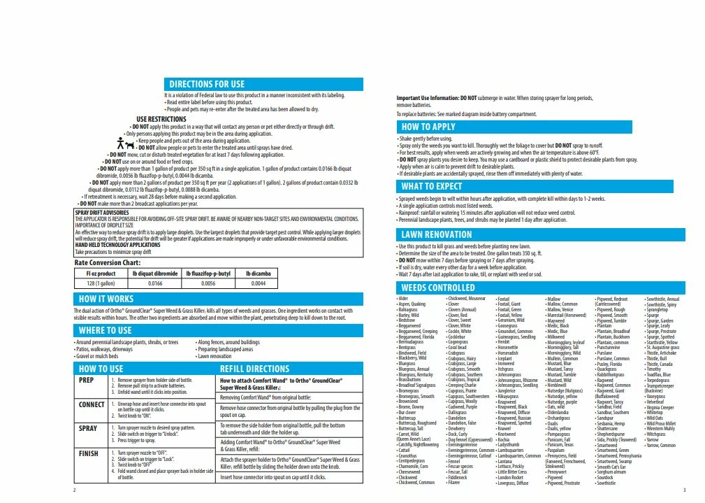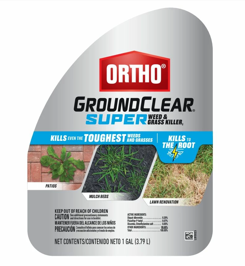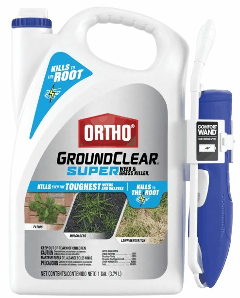 Application is easy thanks to the attached continuous spray Comfort Wand. One ingredient works on contact while the other two ingredients are absorbed and move deep into the weed. Rainfall or watering 15 minutes after applying this weed and grass killer will not reduce the effectiveness of the weed control. A single application of Ortho® GroundClear® Super Weed & Grass Killer1 will start to control even the toughest weeds and grass right down to the roots, so they won’t come back.