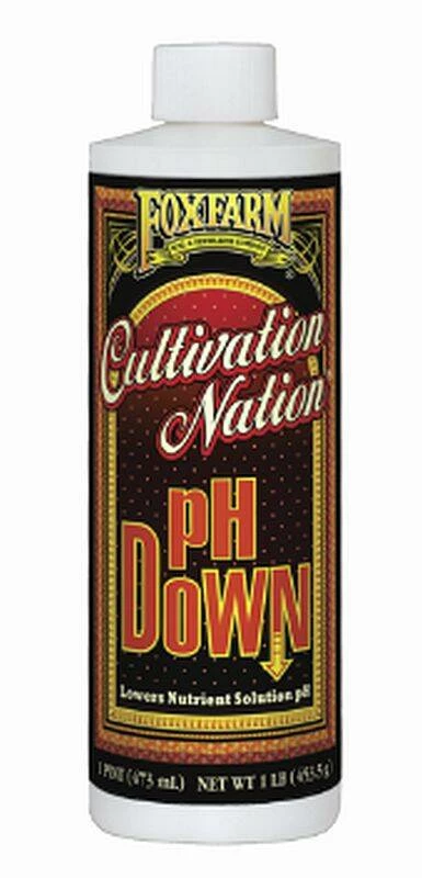 FoxFarm Cultivation Nation pH Down Nutrient, Net Content: 1 gal, Liquid, Vinegar, Dark Brown, Compositions: Citric Acid, Molasses, Boiling Point: 212° F, Specific Gravity: 1.238, pH Range: 2 to 2.2