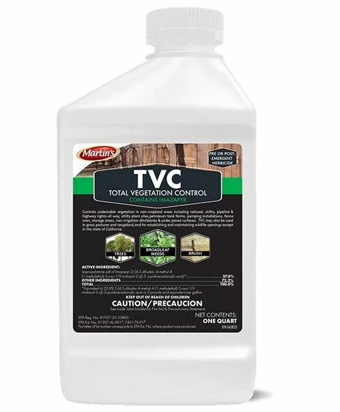 Martin’s Brand TVC is a pre or post-emergent herbicide that may be used in non crop areas such as; railroad, ROW’s, utility plant sites, tank farms, fence rows, for brush control, seed head suppression in pastures & rangelands & other listed sites.