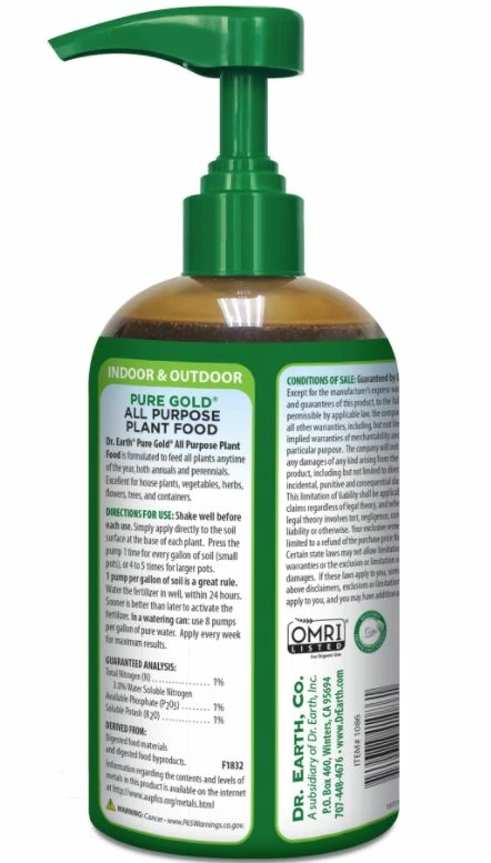 Dr. Earth Pump & Grow products are very quick and easy. Simply apply two pumps directly to the soil and water within 24 hours and it will feed your plants 100% sustainable nutrients for two weeks. Applying directly to the soil makes gardening easy with no mixing and no mess.