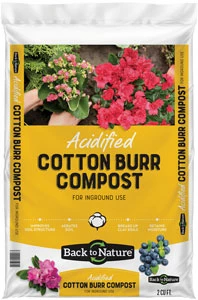 Back to Nature Cotton Burr Compost is truly nature’s perfect soil conditioner. When properly composted, cotton burrs are an excellent food source for the beneficial soil organisms that help to make nutrients available to plants, aerate the soil, and help to keep harmful organisms and diseases in check. Cotton Burr Compost has excellent moisture-retention characteristics and is prized for its ability to break up tight clay soils. Regular cotton burr compost helps to neutralize soil pH, and if additional acidification is needed, our acidified products contain sulfur, the longest-lasting elemental acidifier.