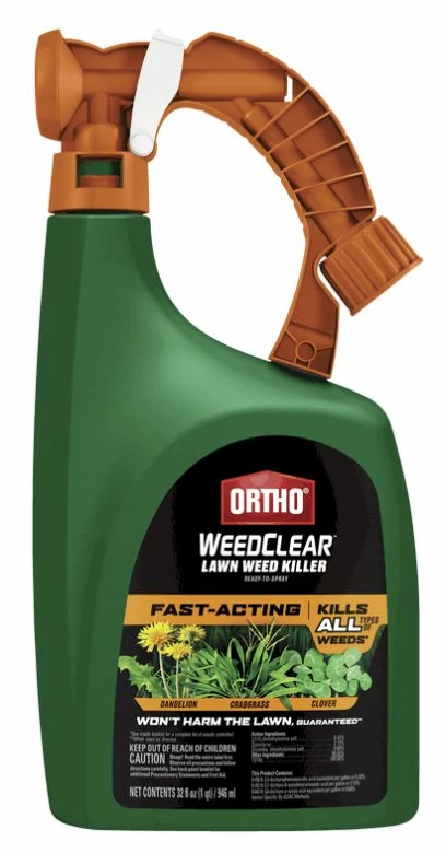 Ortho WeedClear Lawn Weed Killer Ready-to-Spray kills all types of weeds (as listed) without harming your lawn (when used as directed). The formula is rainproof in 1 hour and is fast-acting–you’ll see results in just one application. It kills over 200 weeds down to the roots, including dandelion, chickweed, clover, crabgrass, and foxtail Application is easy: simply connect the garden hose to the attached sprayer. For use on grasses, including Bermudagrass, Buffalograss, Fescues, Kentucky Bluegrass, Ryegrass, and Zoysiagrass. Use Ortho WeedClear Lawn Weed Killer to kill weeds to the roots!