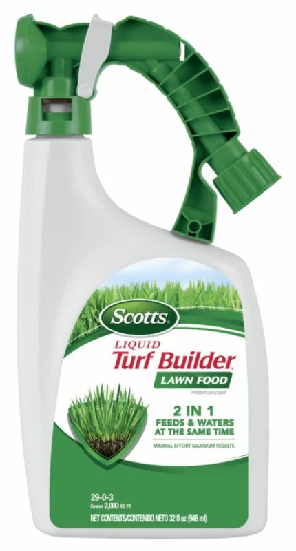 Feed, green and water your lawn, at the same time! Scotts® Liquid Turf Builder® Lawn Food is the easy and quick way to a great-looking green lawn. Apply it during any season, to any grass type (Product should be applied to actively growing grass). Simply connect the bottle to your hose, and spray. This small, yet powerful, 32 fl. oz. bottle has the essential nutrients and feeding power your lawn needs for quick and impactful feeding!