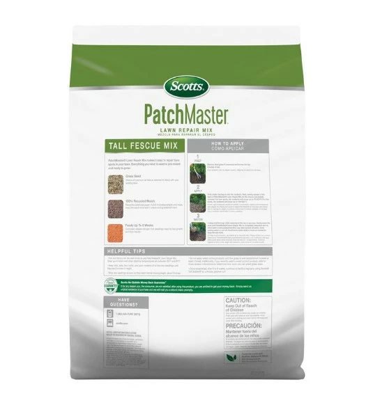 Scotts® PatchMaster® Lawn Repair Mix Tall Fescue Mix comes pre-mixed to make repairing bare spots easy! This product contains a mixture of premium Tall Fescue seed to blend with your existing lawn, 100% recycled mulch to help keep seeds moist and in place, and fertilizer for fast growth and thick results. In fact, this mix starts to grow in as few as 7 days, feeds up to 6 weeks, and absorbs 3x its weight in water! Apply in the fall or spring when daytime temperatures are between 60°F and 80°F. Evenly spread a thin layer of PatchMaster® Lawn Repair Mix so the area is completely covered. A deep and thorough initial watering is the key to success. Gently water the area until PatchMaster® is completely saturated and no more water is being absorbed. Continue to water daily or more as needed to keep the soil moist. One 4.75 lb. bag of Scotts® PatchMaster® Lawn Repair Mix Tall Fescue Mix has a bare spot coverage of 70 sq. ft. and a thin grass coverage of 140 sq. ft.
