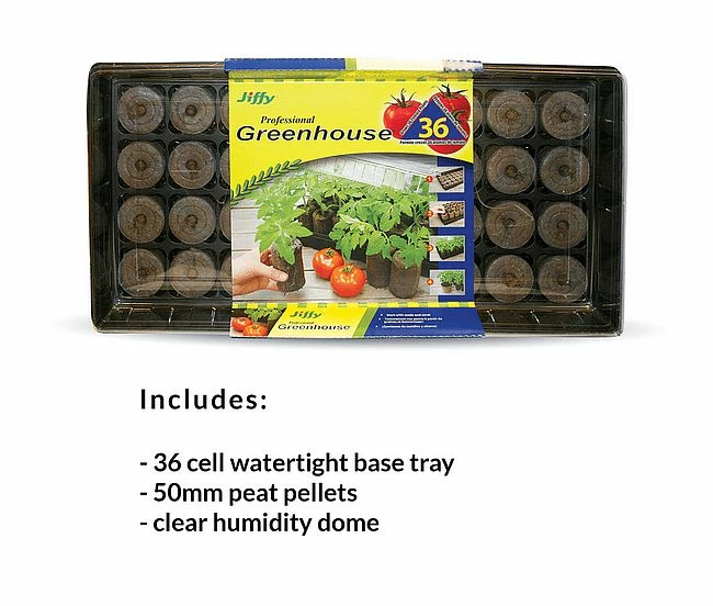 | Includes | One (1) 36 cell watertight base tray, one (1) clear plastic humidity dome, and thirty-six (36) 50mm peat pellets. |
