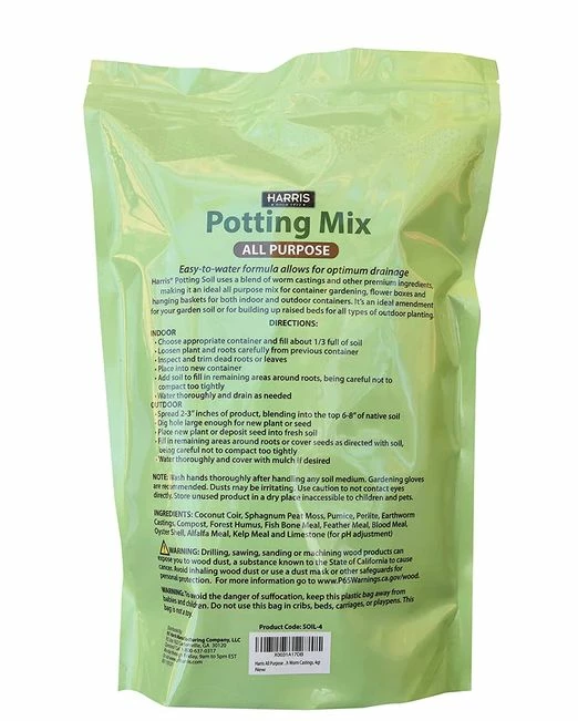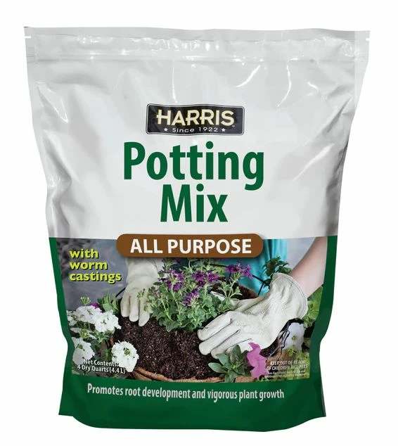 Harris Potting Mix uses a blend of worm castings and other premium ingredients making it an ideal all-purpose mix for container gardening, flower boxes and hanging baskets for both indoor and outdoor containers. Use as an amendment for your garden soil or for building up raised beds for all types of gardening. This potting mix promotes root development and vigorous plant growth. Contains 4 dry quarts.