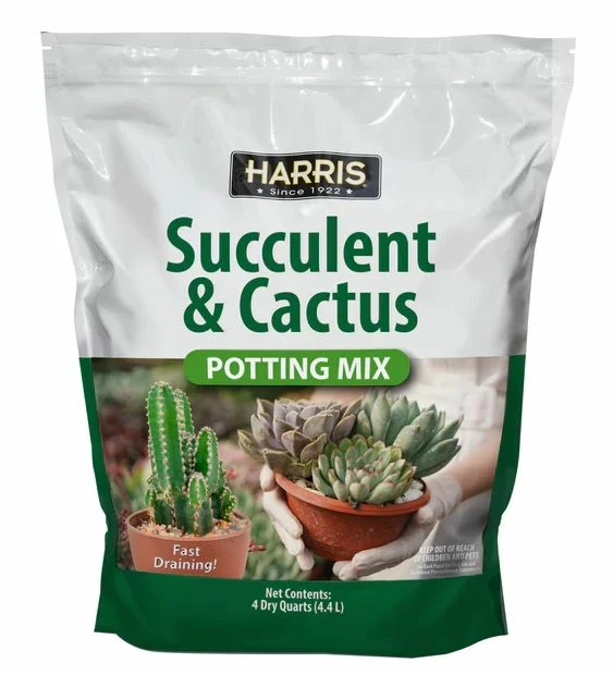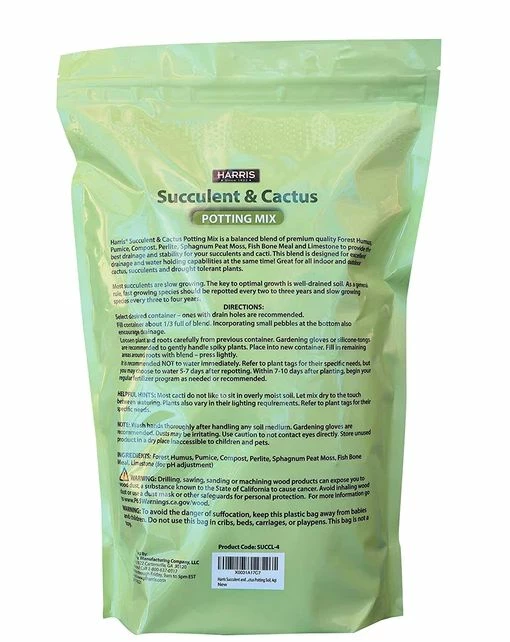 Harris Succulent & Cactus Potting Mix is a balanced blend of premium quality Forest Humus, Pumice, Compost, Perlite, Sphagnum Peat Moss, Fish Bone Meal and Limestone to provide the best drainage and stability for your succulents and cacti. This blend is designed for excellent drainage and water holding capabilities at the same time! Great for all indoor and outdoor cactus, succulents and drought tolerant plants. Contains 4 dry quarts.