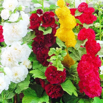 This popular mixture produces bright, giant, fully double flowers in a color range of rose, salmon, white and red. Blooms cover the entire height of the stalk. Flowers attract hummingbirds.