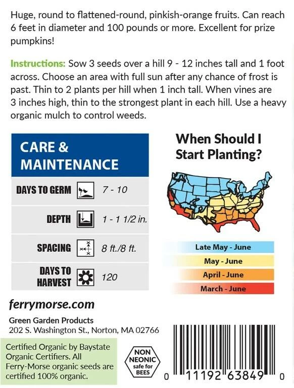 Grow a giant pumpkin with these organic, non-GMO seeds. They make excellent prize-sized pumpkins. Big Max Pumpkin seeds produce huge, round to flattened-round pumpkins that have a pinkish-orange coloring.
