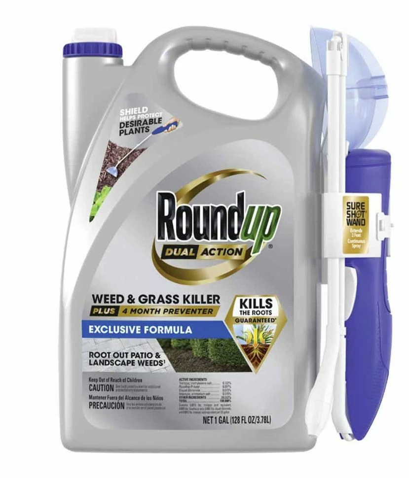 Root out the toughest weeds and grasses with Roundup® Dual Action Weed and Grass Killer Plus 4 Month Preventer with Sure Shot™ Wand. This formula kills existing weeds and grass down to the root, and prevents new weeds from growing for up to 4 months by creating an invisible barrier in the soil. Apply only where you want to kill existing weeds AND prevent future weed growth for up to 4 months, such as cracks and crevices in driveways, sidewalks, and patios, along fences, in mulched beds or around the base of well-established desirable plants, shrubs, or trees, and on gravel areas. In order to prevent new weeds and grasses from growing, you must spray the entire area you want to control, not just the emerged weeds. For best results, apply during warm, sunny weather above 60°F. Rain or watering 30 minutes after application will NOT wash away effectiveness. After application, weeds will begin to yellow and wilt within hours with complete kill in 1 to 2 weeks. All ornamental bedding plants (annuals and perennials), trees, shrubs, sod and seed can be planted 4 months after application. Roundup® Dual Action covers up to 300 sq. ft.