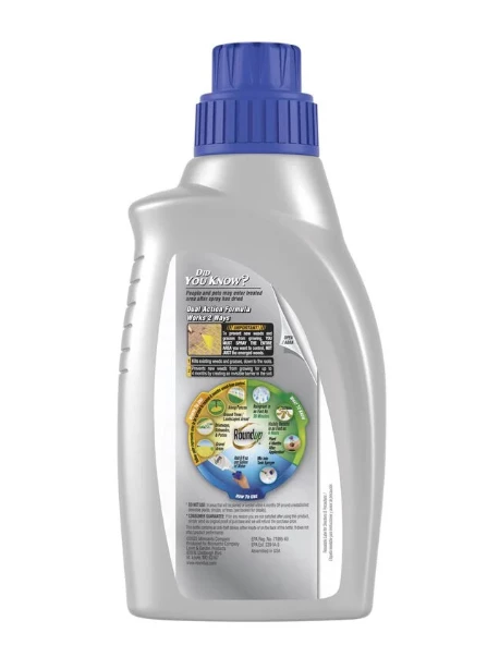 Root out the toughest weeds and grasses with Roundup® Dual Action Weed & Grass Killer Plus 4 Month Preventer Concentrate. This formula kills existing weeds and grass down to the root, and prevents new weeds from growing for up to 4 months by creating an invisible barrier in the soil. Apply only where you want to kill existing weeds AND prevent future weed growth for up to 4 months, such as cracks and crevices in driveways, sidewalks, and patios, along fences, in mulched beds or around the base of well-established desirable plants, shrubs, or trees, and on gravel areas. In order to prevent new weeds and grasses from growing, you must spray the entire area you want to control, not just the emerged weeds. For best results, apply during warm, sunny weather above 60°F. Rain or watering 30 minutes after application will NOT wash away effectiveness. After application, weeds will begin to yellow and wilt within hours with complete kill in 1 to 2 weeks. All ornamental bedding plants (annuals and perennials), trees, shrubs, sod and seed can be planted 4 months after application. Roundup® Dual Action Concentrate covers up to 1,600 sq. ft.