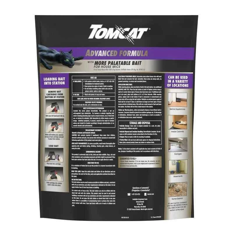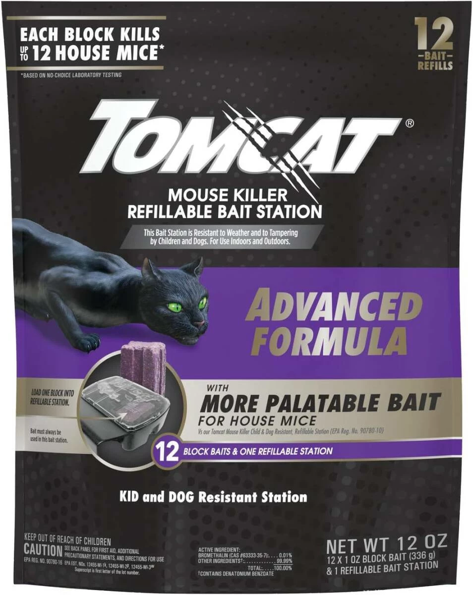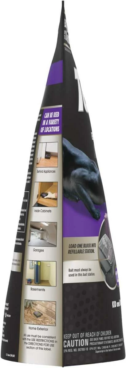 The Tomcat® Mouse Killer Refillable Bait Station – Advanced Formula controls mice with an advanced formulation bait block that is more attractive to house mice (compared to our Tomcat Mouse Killer Child and Dog Resistant Refillable Station [EPA Reg. No. 90780-10]). This Tomcat® mouse bait station can be placed indoors or outdoors and it’s resistant to weather and tampering by children and dogs. Each block of bait can kill up to 12 house mice (based on no-choice laboratory testing) and each package contains 12 blocks. Bait stations with mouse poison should be placed beside burrows, along walls, behind kitchen appliances, inside cabinets, in garages and basements, and along the exterior of the home. If more than one station is being used, place them at 8- to 12-foot intervals. Mice will likely eat a small portion of the bait and then leave the station. The Tomcat® Mouse Killer Refillable Bait Station – Advanced Formula has a clear cover to make it easy to monitor the bait block. When there is no more bait in the station, easily refill it with one of the provided bait blocks (only use one at a time).