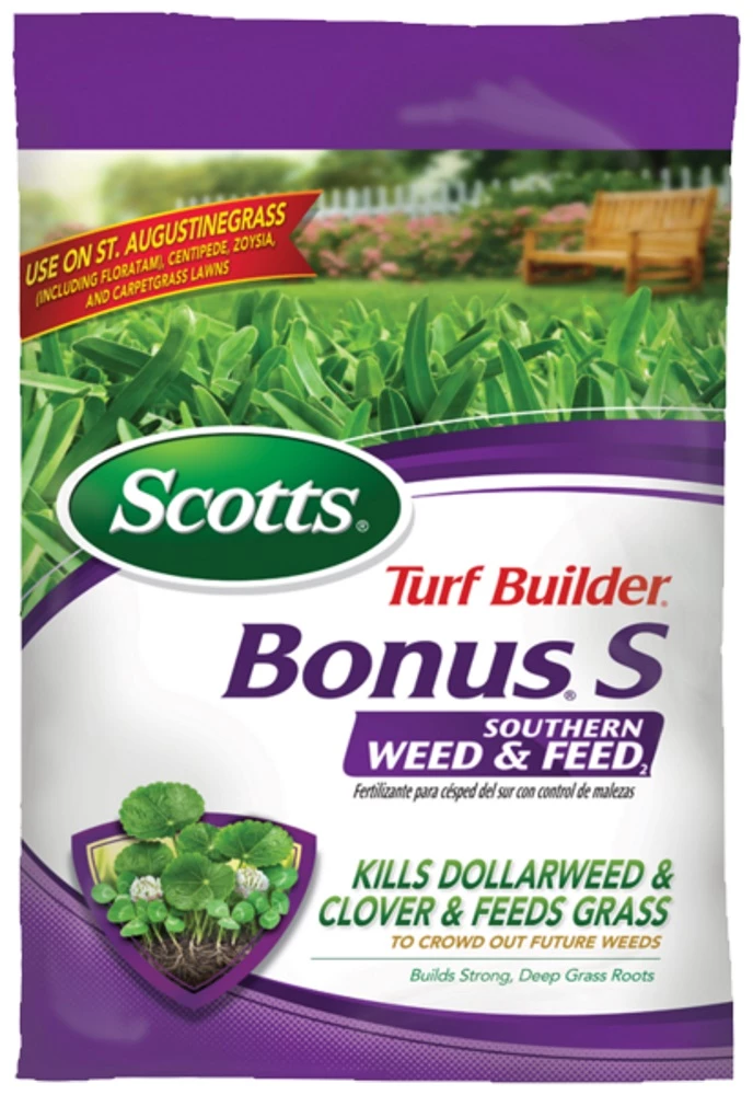 Scotts® Turf Builder® Bonus® S Southern Weed and Feed will not only kill weeds, but also thicken your lawn to help crowd out future weeds. Regular feedings provide the nutrients your lawn needs to look its best and withstand the stresses of heat, drought and family activity. Bonus® S may be used on St. Augustine grass, centipede, zoysia and carpetgrass lawns.