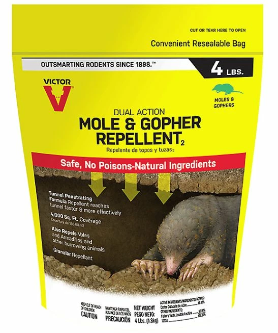Stay a step ahead of mole and gopher invaders with Victor Mole & Gopher Repellent. It uses a dual action formula to target the senses of burrowing animals, such as moles, gophers, voles and more. The granules penetrate their tunnels, creating an unpleasant environment, which drives them away before they have a chance to do further damage around your yard. In addition, its easy to use. Simply apply the granules to your yard to gradually to drive them out. For your convenience, it comes in a resealable bag for easy storage.