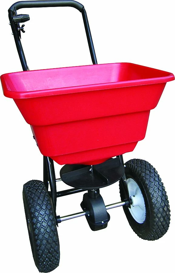 Durable, lightweight and rustproof poly hopper with sturdy steel frame. Rust resistant powder coat finish. Adjustable flow rate for optimal material coverage. Knobby tread pneumatic tires with sleek rims. 80 lb. hopper capacity. Spreads an area up to 12 ft wide.