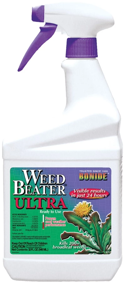 The ultimate systemic broadleaf weed killer for lawn and turf. New chemistry thats especially effective on over 200 hard to kill weeds, right to the roots. Visible results in just 24 hours! Rain fast once dry. Reseed in just 2 weeks! Superior cool weather performance down to 45F extends application window to early spring and to late fall, when weeds are most susceptible. Non 2, 4-D formula contains MCPA, Mecoprop-p, Dicamba and Carfentrazone. MCPA, Mecoprop-p, Dicamba, and Carfentrazone. Weed Beater ULTRA has quickly become our #1 broadleaf weed control.